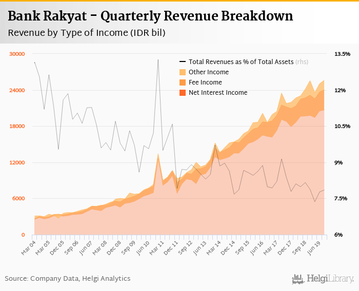Bank Rakyat generated total banking revenues of IDR 25,630 bil in the third quarter of 2019, up 6.15% when compared to the same period of last year and 2.4% when compared to the previous quarter.