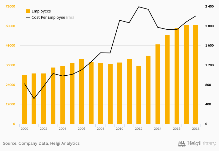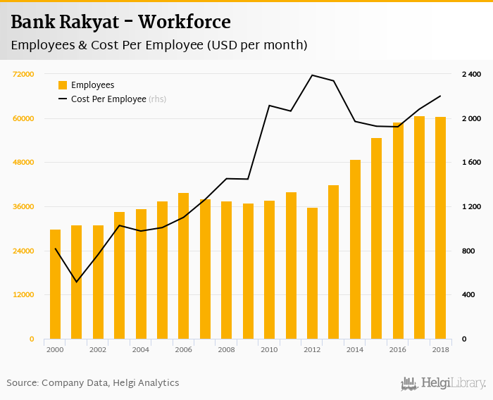 Bank Rakyat employed 60,553 persons in 2018, down 0.214% when compared to the previous year. Historically, the bank's workforce hit an all time high of 60,683 persons in 2017 and an all time low of 29,957 in 2000.