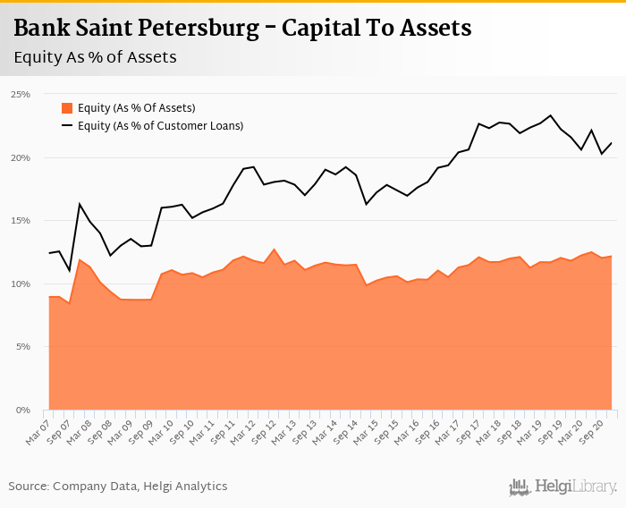 Bank Saint Petersburg's Equity reached 12.1% of total assets in the 4Q2020, up from 11.8% for the previous year. As a share of net customer loans, the ratio amounted to 21.1% at the end of the fourth quarter of 2020.