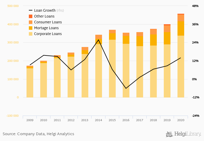 Mortgage loans represented 17.0% of the bank's loan book at the end of the year 2020, consumer further 8.06% and corporate loans 73.8% of total loans.