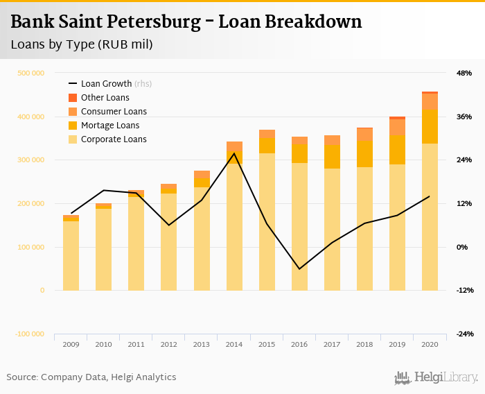 At the end of 2020, Bank Saint Petersburg's loans accounted for 89.1% of total deposits and 57.4% of total assets.