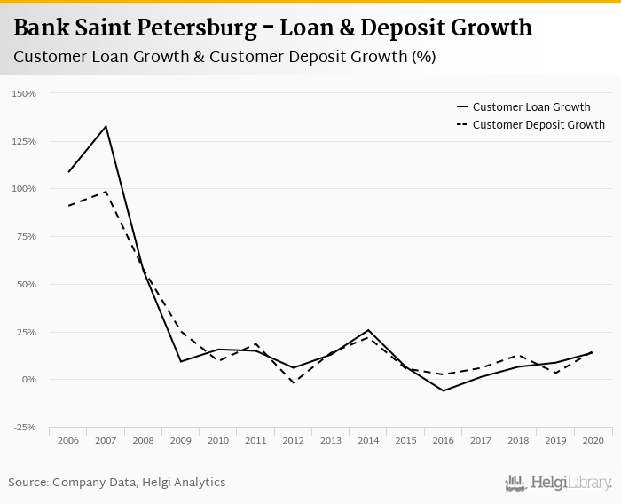 Bank Saint Petersburg's customer loan growth reached 14.0% in 2020, up from 8.64% compared to the previous year. Historically, the bank’s loans growth reached an all time high of 133% in 2007 and an all time low of -6.14% in 2016. In the last decade, the average annual loan growth amounted to 8.66%.