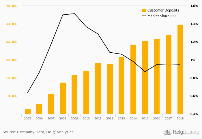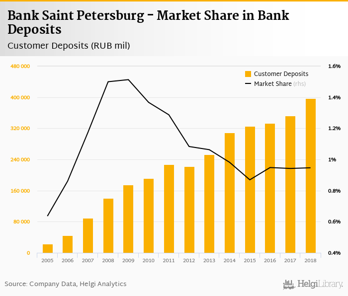 Bank Saint Petersburg accounted for 0.946% of all customer deposits taken by banks in Russia at the end of 2018. Historically, the bank’s market share in customer deposits reached an all time high of 1.51% in 2009 and an all time low of 0.636% in 2005.