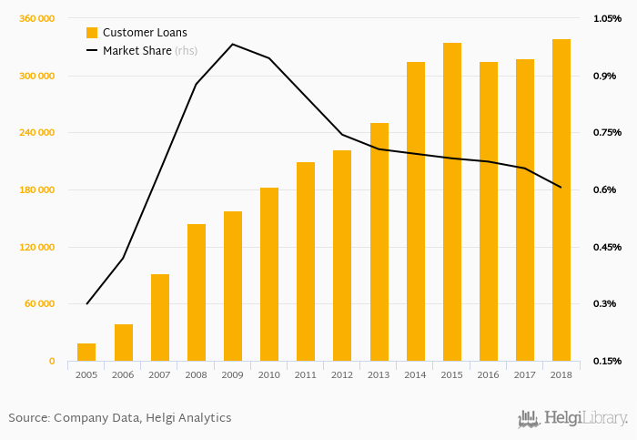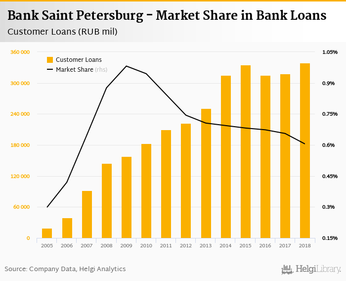 Bank Saint Petersburg accounted for 0.605% of all customer loans issued in Russia at the end of 2018. Historically, the bank’s market share in customer loans reached an all time high of 0.982% in 2009 and an all time low of 0.298% in 2005.