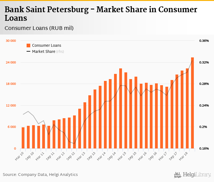 Bank Saint Petersburg's consumer loans reached RUB 25,370 mil in 2018-06-30, up 13.7% compared to the previous year.