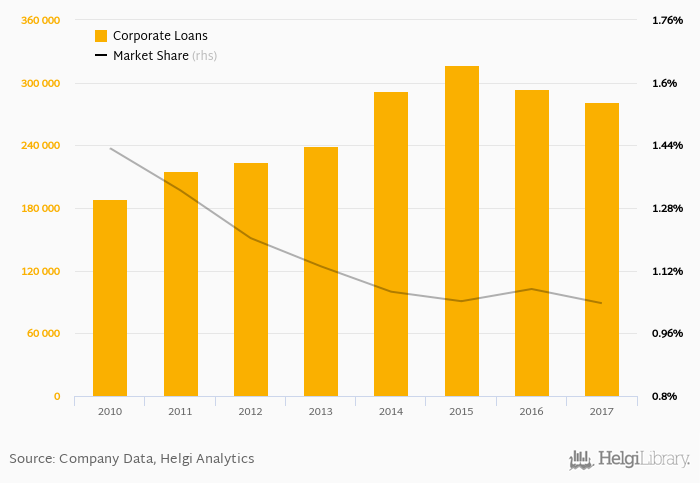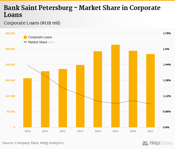 Bank Saint Petersburg accounted for 1.04% of all corporate loans issued in Russia at the end of 2017. Historically, the bank’s market share in corporate loans reached an all time high of 1.43% in 2010 and an all time low of 1.04% in 2017.