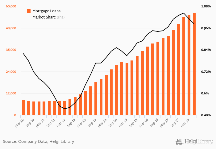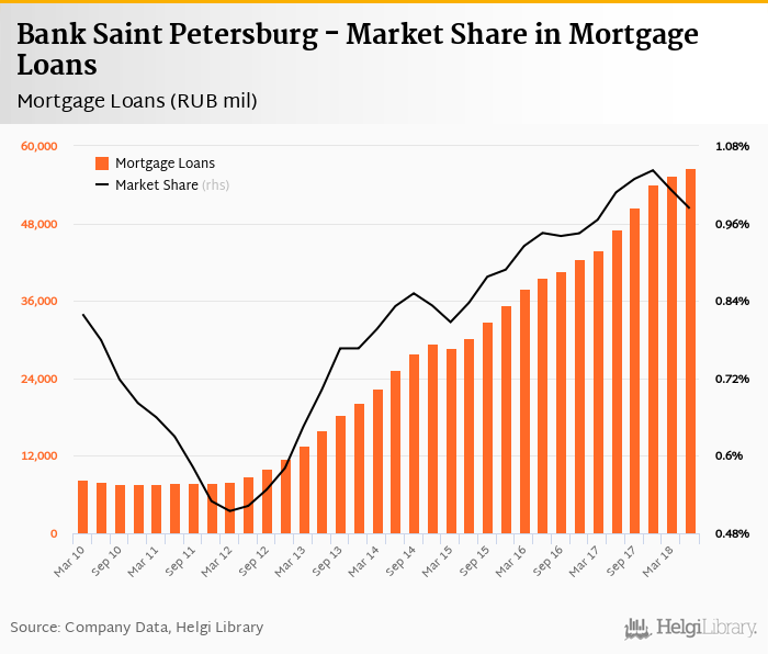 Bank Saint Petersburg accounted for 0.983% of all mortgage loans issued in Russia at the end of 2Q2018. Historically, the bank’s market share in mortgage loans reached an all time high of 1.04% in 4Q2017 and an all time low of 0.514% in 1Q2012.