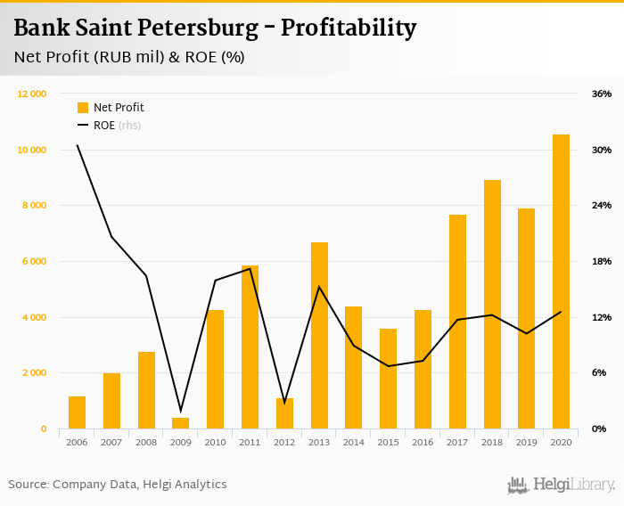 Bank Saint Petersburg made a net profit of RUB 10,558 mil in 2020, up 33.6% compared to the previous year. This implies a return on equity of 12.6%.
