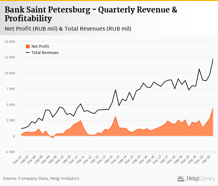 Bank Saint Petersburg made a net profit of RUB 4,494 mil under revenues of RUB 12,276 mil in the fourth quarter of 2020, up 86.8% and 15.8% respectively when compared to the same period last year.