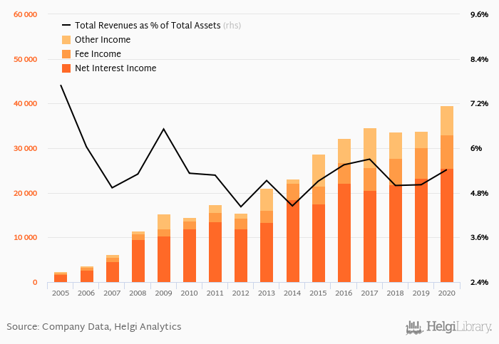 Bank's total revenues accounted for 5.42% total assets in 2020, up from 5.02% a year earlier.