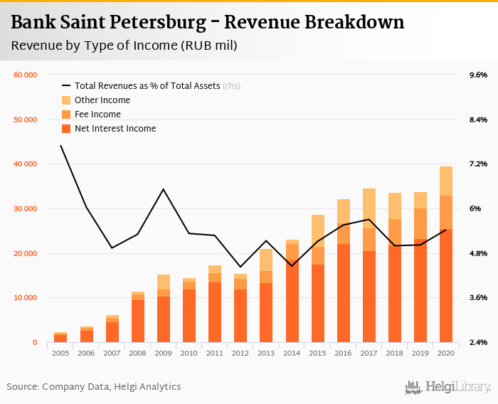 Bank Saint Petersburg generated total banking revenues of RUB 39,601 mil in 2020, up 17.2% compared to the previous year.
