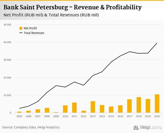 Bank Saint Petersburg made a net profit of RUB 10,558 mil under revenues of RUB 39,601 mil in 2020, up 33.6% and 17.2% respectively compared to the previous year.
