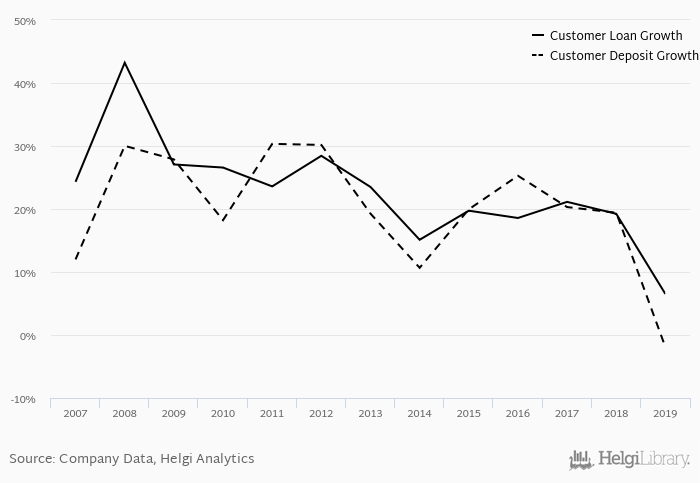 On the other hand, bank's customer deposit growth amounted to -1.93% at the end of 2019, down from 19.4% when compared to the previous year. Historically, the bank’s deposit growth reached an all time high of 30.3% in 2011 and an all time low of -1.93% in 2019. In the last decade, the average annual loan growth amounted to 18.8%.