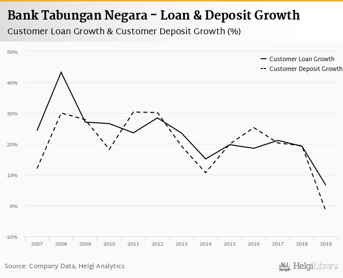 Bank Tabungan Negara's customer loan growth reached 6.50% in 2019, down from 19.2% compared to the previous year. Historically, the bank’s loans growth reached an all time high of 43.2% in 2008 and an all time low of 6.50% in 2019. In the last decade, the average annual loan growth amounted to 20.1%.