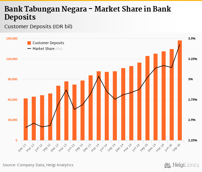 Bank Tabungan Negara accounted for 3.43% of all customer deposits taken by banks in Indonesia at the end of 2016-09-30. Historically, the bank’s market share in customer deposits reached an all time high of 3.43% in 2016-09-30 and an all time low of 2.41% in 2011-12-31.