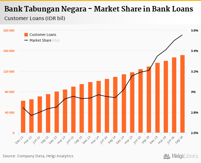 Bank Tabungan Negara's customer loans reached IDR 151,641 bil in 2016-09-30, up 2.99% compared to the previous year.