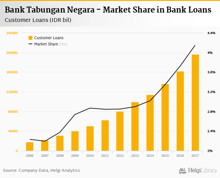 Bank Tabungan Negara accounted for 4.15% of all customer loans issued in Indonesia at the end of 2017. Historically, the bank’s market share in customer loans reached an all time high of 4.15% in 2017 and an all time low of 2.19% in 2007.