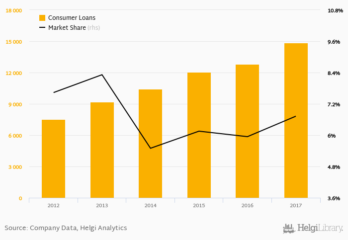 Bank Tabungan Negara accounted for 6.73% of all consumer loans issued in Indonesia at the end of 2017. Historically, the bank’s market share in consumer loans reached an all time high of 8.32% in 2013 and an all time low of 5.50% in 2014.