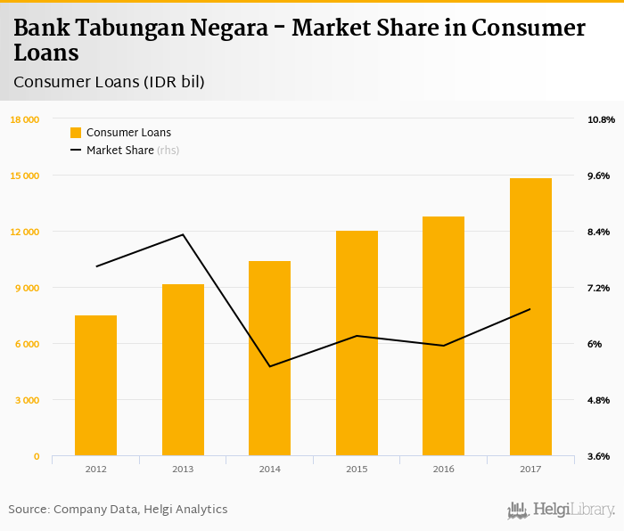 Bank Tabungan Negara's consumer loans reached IDR 14,862 bil in 2017, up 16.1% compared to the previous year.
