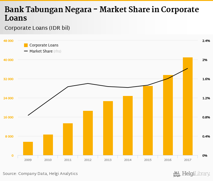 Bank Tabungan Negara's corporate loans reached IDR 41,031 bil in 2017, up 21.8% compared to the previous year.