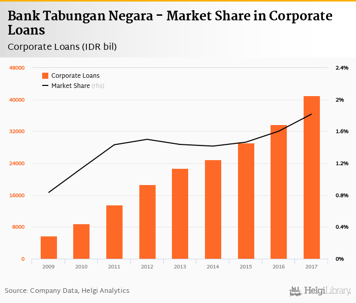 Bank Tabungan Negara's corporate loans reached IDR 41,031 bil in 2017, up 21.8% compared to the previous year.