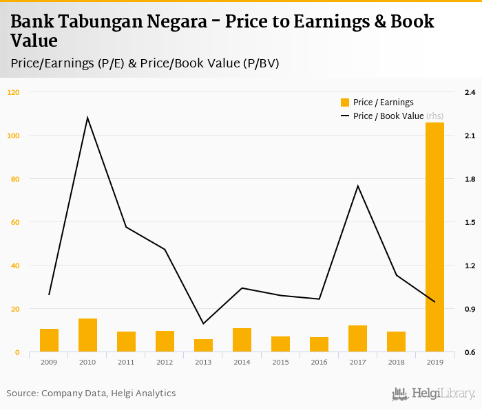 At the end of 2019, the bank traded at price to earnings of 106x. Within the last five years, the multiple reached an all time high of 106x in 2019 and an all time low of 7.04x in 2016 with an average of 28.5x.