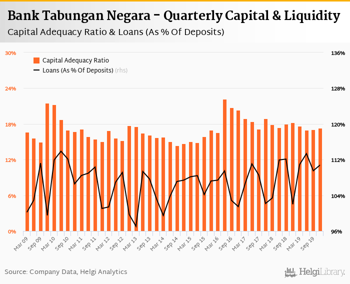 Bank Tabungan Negara's capital adequacy ratio reached 17.3% at the end of fourth quarter of 2019, up from 17.1% when compared to the previous quarter. Historically, the bank’s capital ratio hit an all time high of 22.2% in 2Q2016 and an all time low of 14.4% in 3Q2014.