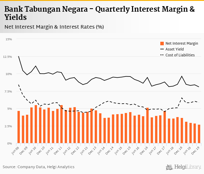 Bank Tabungan Negara's net interest margin amounted to 2.68% in the fourth quarter of 2019, down from 2.84% when compared to the previous quarter.