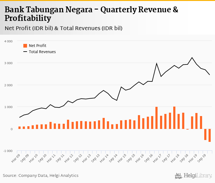 Bank Tabungan Negara made a net profit of IDR -592 bil under revenues of IDR 2,446 bil in the fourth quarter of 2019, down 204% and 24.4% respectively when compared to the same period last year.