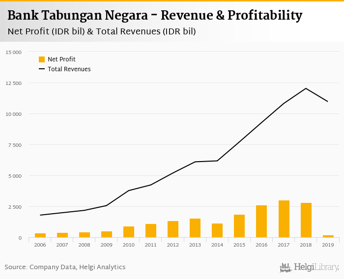 Bank Tabungan Negara made a net profit of IDR 209 bil under revenues of IDR 10,951 bil in 2019, up -92.5% and -8.93% respectively compared to the previous year.