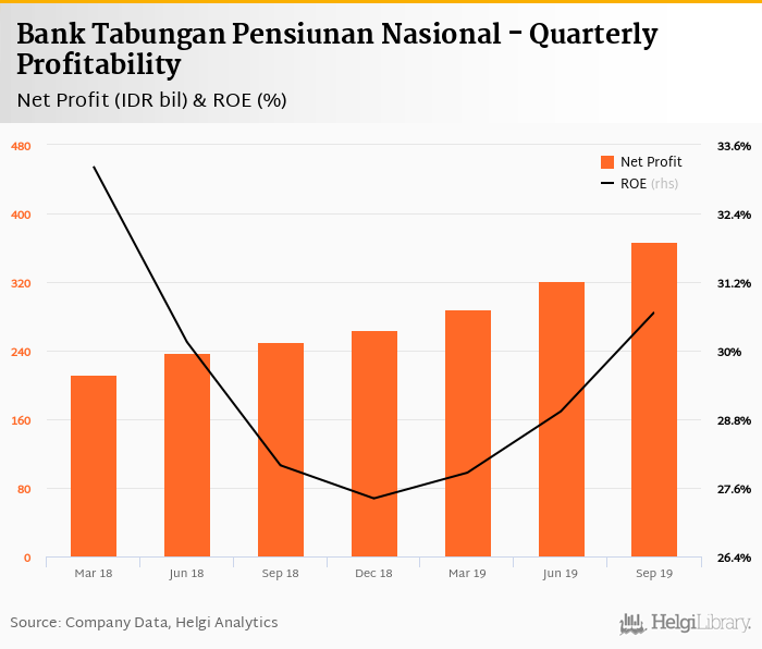 Bank Tabungan Pensiunan Nasional made a net profit of IDR 366 bil in the third quarter of 2019, up 46.3% when compared to the same period of last year. This implies a return on equity of 30.7%.