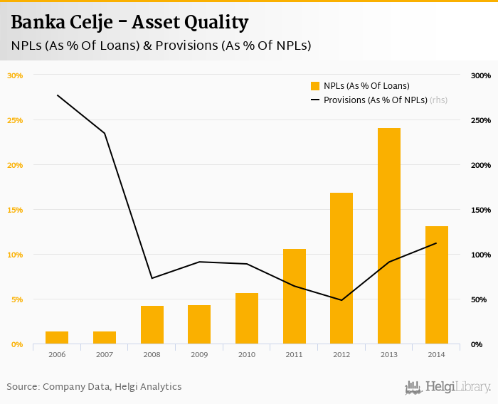 Comparing Banka Celje with its closest peers, Nova Ljubljanska banka operated at the end of 2014 with NPL ratio of 32.2% and provision coverage of 61.0%, NKBM Group with 25.8% and 94.4% respectively and SKB Banka had 6.67% of bad loans covered with 168% by provisions at the end of 2014.