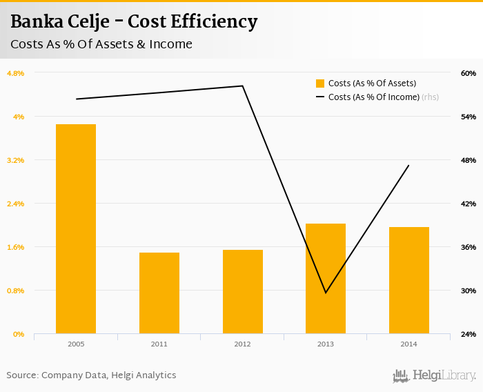 Comparing Banka Celje with its closest peers, Nova Ljubljanska banka operated in 2014 with a cost to income ratio of 59.0% in 2014, NKBM Group reached 56.6% and SKB Banka some 51.6%.