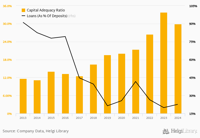 Bank's loan to deposit ratio reached 22.6% at the end of 2024, up from 19.9% when compared to the previous year. Some 10 years ago, loan to deposit ratio of the bank amounted to 82.5%.