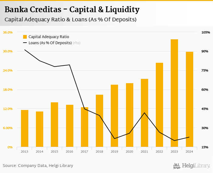 Banka Creditas's capital adequacy ratio reached 29.9% at the end of 2024, down from 33.8% compared to the previous year. Historically, the bank’s capital ratio hit an all time high of 33.8% in 2023 and an all time low of 11.1% in 2014.