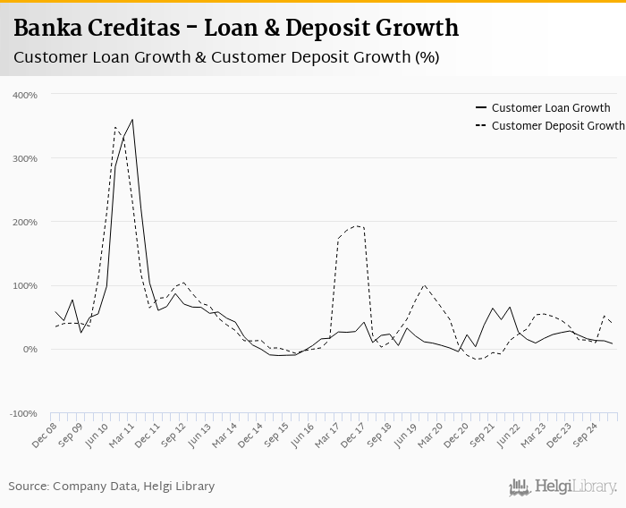 At the end of 2025-03-31, Banka Creditas's loans accounted for 21.2% of total deposits and 19.4% of total assets.