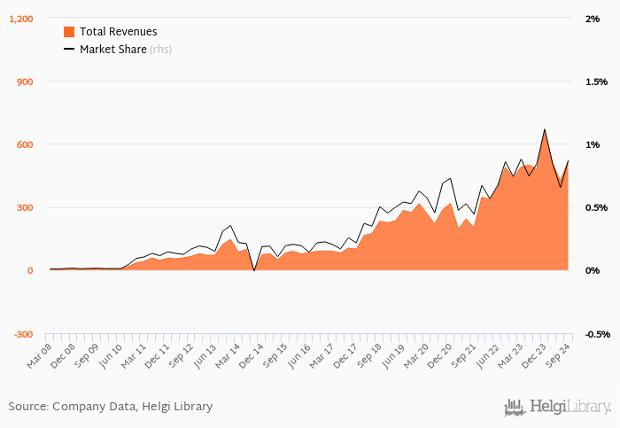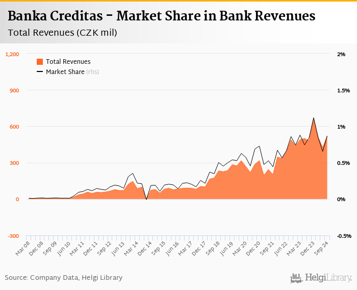 As a result, Banka Creditas accounted for 0.867% of all bank revenues generated by banks in Czechia in 2024-09-30. Historically, the bank’s market share in total revenues reached an all time high of 1.12% in 2023-12-31 and an all time low of -0.008% in 2014-09-30.