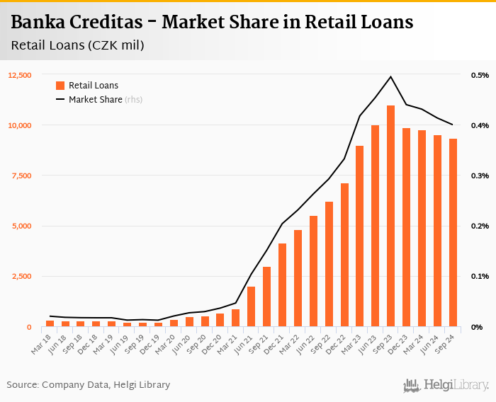 Banka Creditas's retail loans reached CZK 9,331 mil in the third quarter of 2024, down 1.77% compared to the previous year.