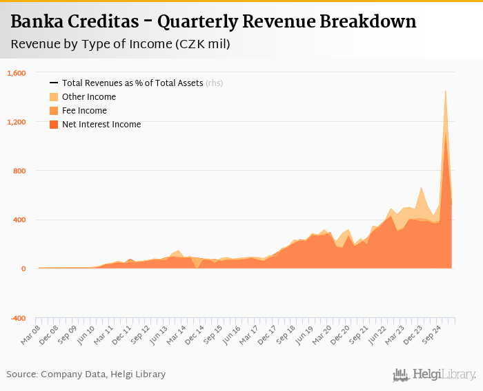 Historically, the bank’s revenues containing of interest, fee and other non-interest income reached an all time high of CZK mil in 1Q1970 and an all time low of CZK mil in 1Q1970. The average revenue in the last six quarters amounted to