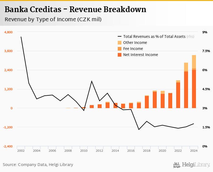Comparing Banka Creditas with its closest peers, Ceska Sporitelna generated total revenues of 2.78% of assets in 2024, CSOB operated with 2.35% revenue margin and Komercni Banka produced total income worth 2.39% of assets.