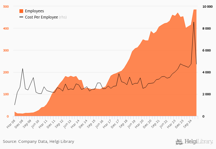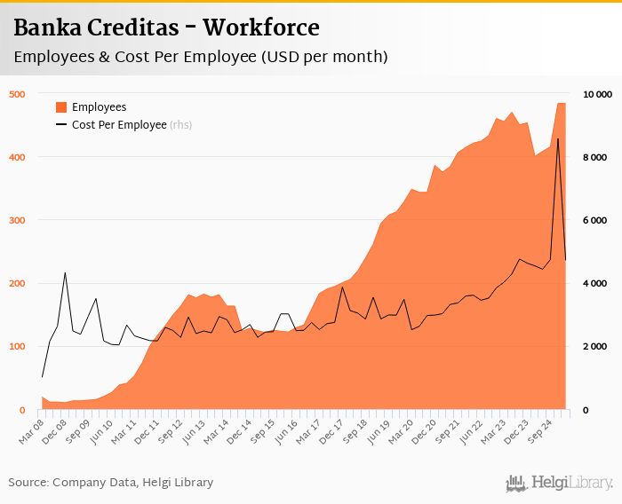 Banka Creditas employed 484 persons in 2025-03-31, down 0% when compared to the previous year. Historically, the bank's workforce hit an all time high of 484 persons in 2025-03-31 and an all time low of 10.0 in 2008-12-31.