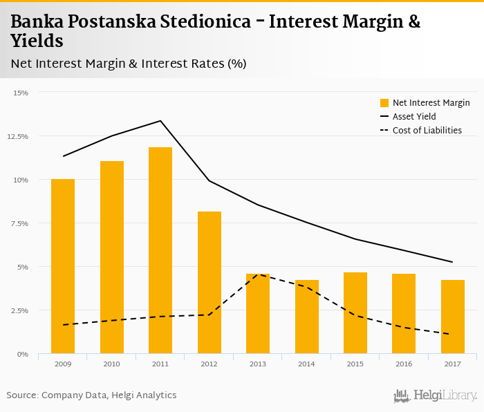 Banka Postanska Stedionica's net interest margin amounted to 4.26% in 2017, down from 4.59% compared to the previous year.