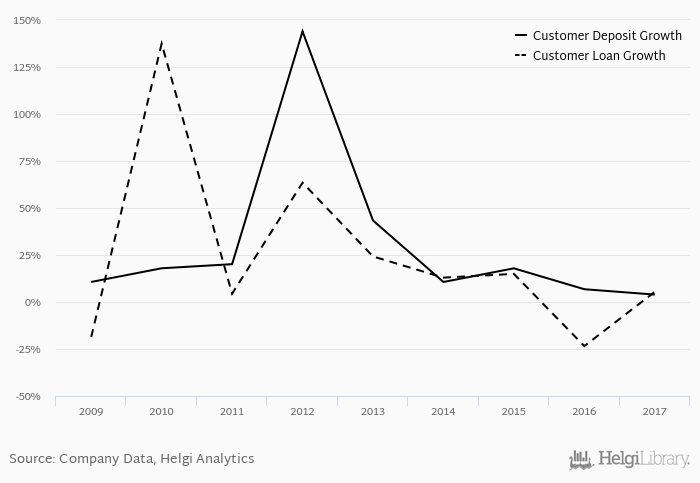 On the other hand, bank's customer deposit growth amounted to 3.94% at the end of 2017, down from 6.79% when compared to the previous year. Historically, the bank’s deposit growth reached an all time high of 144% in 2012 and an all time low of 3.94% in 2017. In the last decade, the average annual loan growth amounted to 0%.