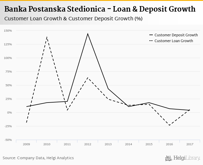 Banka Postanska Stedionica's customer loan growth reached 5.37% in 2017, up from -23.5% compared to the previous year. Historically, the bank’s loans growth reached an all time high of 137% in 2010 and an all time low of -23.5% in 2016. In the last decade, the average annual loan growth amounted to 0%.