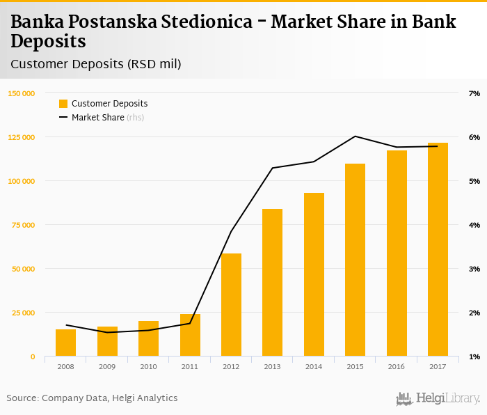 Banka Postanska Stedionica accounted for 5.78% of all customer deposits taken by banks in Serbia at the end of 2017. Historically, the bank’s market share in customer deposits reached an all time high of 6.00% in 2015 and an all time low of 1.53% in 2009.