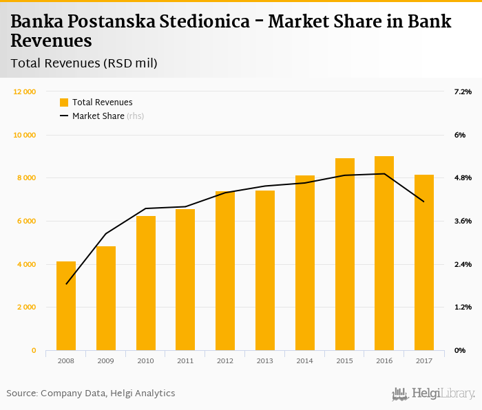 Banka Postanska Stedionica generated total banking revenues of RSD 8,163 mil in 2017, down 9.73% compared to the previous year.
