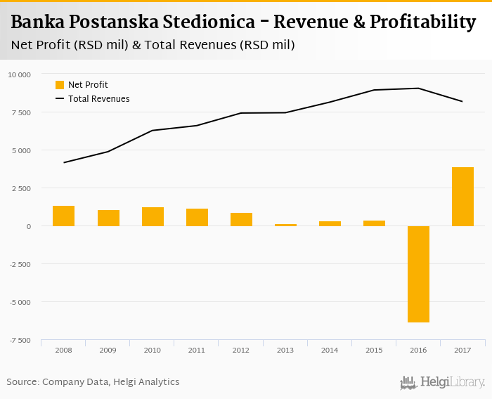 Banka Postanska Stedionica made a net profit of RSD 3,879 mil under revenues of RSD 8,163 mil in 2017, up 161% and -9.73% respectively compared to the previous year.