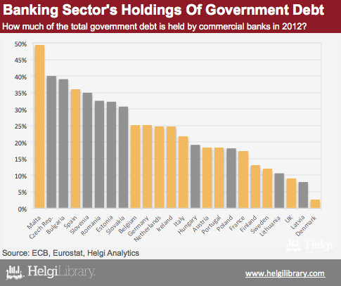 Although Central European countries are less indebted than their West-European neighbours on the public front, their banks are more involved in the funding of the government debt. Based on the data from the ECB and Eurostat, banks in Slovakia, Estonia, Romania, Slovenia, Bulgarian and the Czech Republic hold around a third of the total government debt.