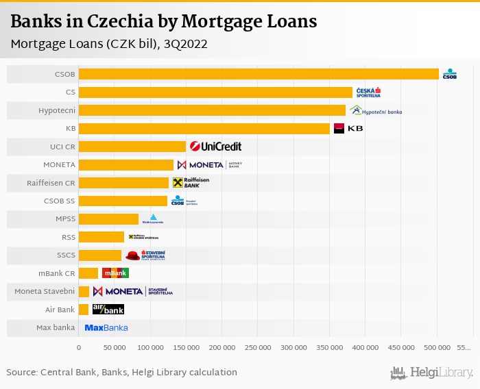 Overall, CSOB was the largest mortgage lender with 30.4% of the market followed by Ceska Sporitelna (with a 23.1% share ) and Hypotecni Banka (22.5%). Looking at the last 12 months, Modra Pyramida Stavebni Sporitelna gained the most in market share - 16.0 bp to 5.10% - compared to Stavebni Sporitelna Ceske Sporitelny's 15.4 bp (to 3.65%) and Raiffeisen Stavebni Sporitelna's 14.7 bp (a market share of 3.89%).