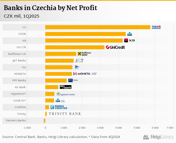 Ceska Sporitelna generated the largest net profit in the last quarter (CZK 5,748 mil) followed by CSOB and Komercni Banka. At the other end of the scale was Partners Banka with a reported loss of CZK 80.4 mil.